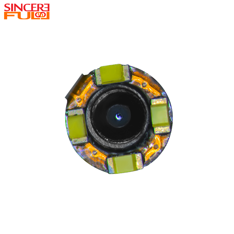 This is 1MP HD miniature OV9734 sensor medical endoscope camera module, equipped with OmniVision OV9734 CMOS color image sensor. It features 1MP pixels, supports 1280x720 resolution and a maximum frame rate of 30FPS. The 1/9-inch sensor paired with 1.4μmx1.4μm pixel size ensures basic imaging capabilities. Its core advantage lies in the precise combination of F4.0 aperture and 1.25mm focal length. It not only expands the observation range through the short focal length combined with 90° DFOV but also balances light intake and lens volume with the reasonable aperture. Combined with the 3.6mm slim lens diameter, it can easily enter narrow spaces. At the same time, it supports a wide focusing range of 10-100mm and manual focusing, with distortion < -20% to ensure true imaging. The module adopts an integrated design, integrates 4 LED beads for supplementary lighting, and is produced as a bare module through SMT process and AA process, providing high flexibility and stable performance for equipment integration. | ![]() |