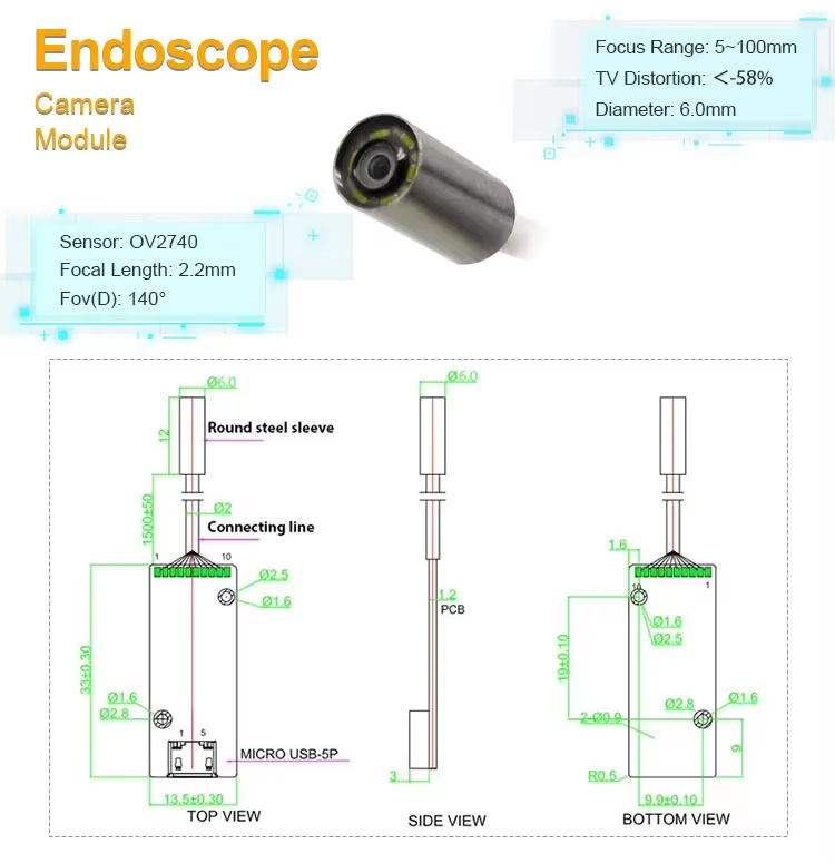 これは、OV2740 センサーを搭載した全ガラス製カメラ モジュールで、医療、歯科、産業用アプリケーション向けに設計されており、2 メガピクセルで 1920 x 1080 の高品質画像を提供します。ミニピンホール内視鏡カメラモジュールは140°の広角レンズを搭載しており、サイズはわずか6.0 x 6.0 mmです。複数の出力フォーマットとプログラム可能な制御をサポートし、Micro-USB インターフェイスを含む複数のデバイスとのシームレスな接続を保証します。このモジュールは IP67 等級に準拠しており、防水性、耐油性、防塵性があり、消毒プロセスは迅速かつ簡単です。さらに、強化されたイメージング、インターレース HDR RAW データ出力、および自動ゲイン制御を備え、さまざまなアプリケーション要件を満たして画質と信頼性を確保します。